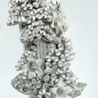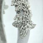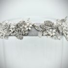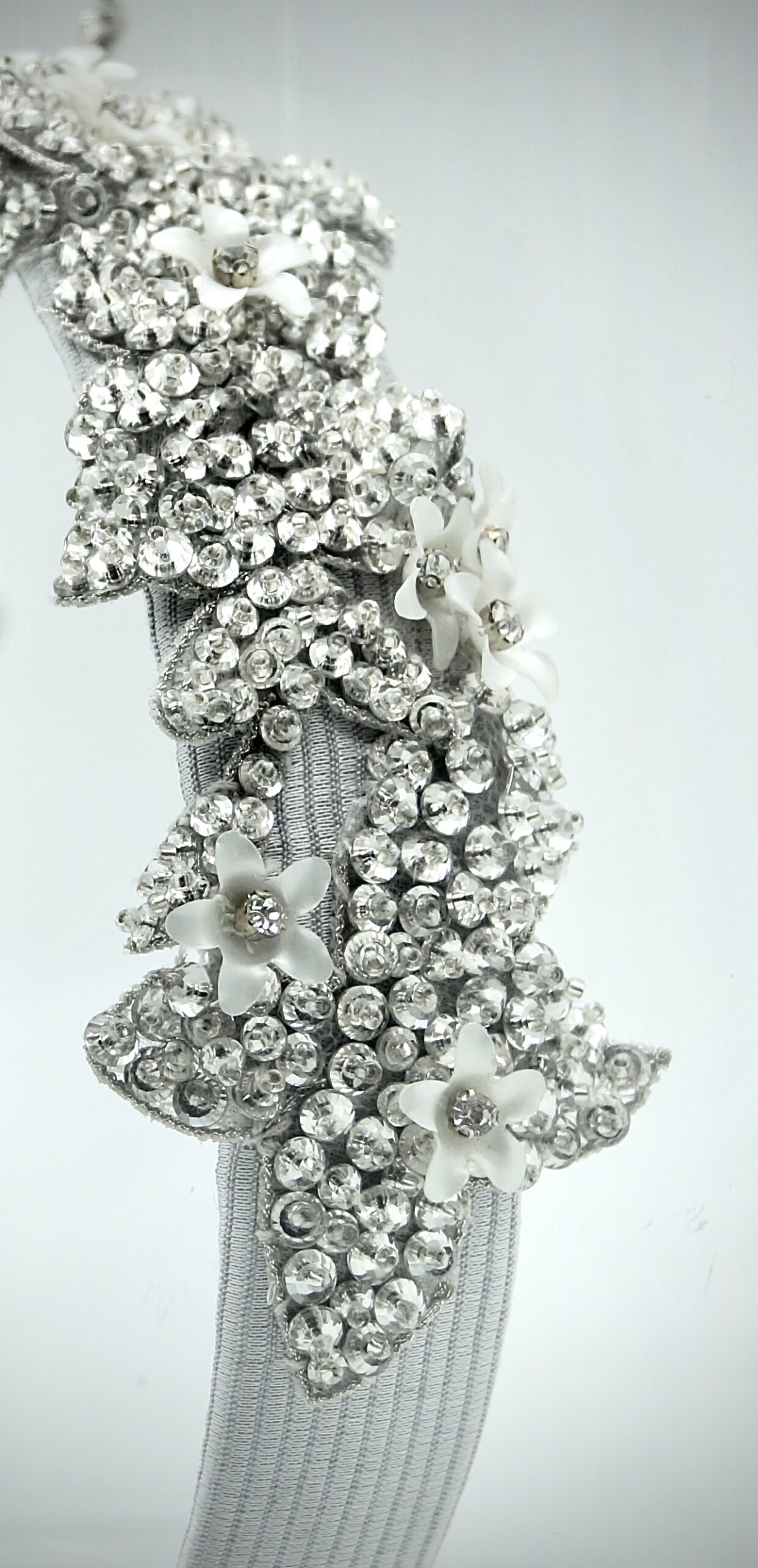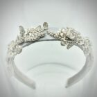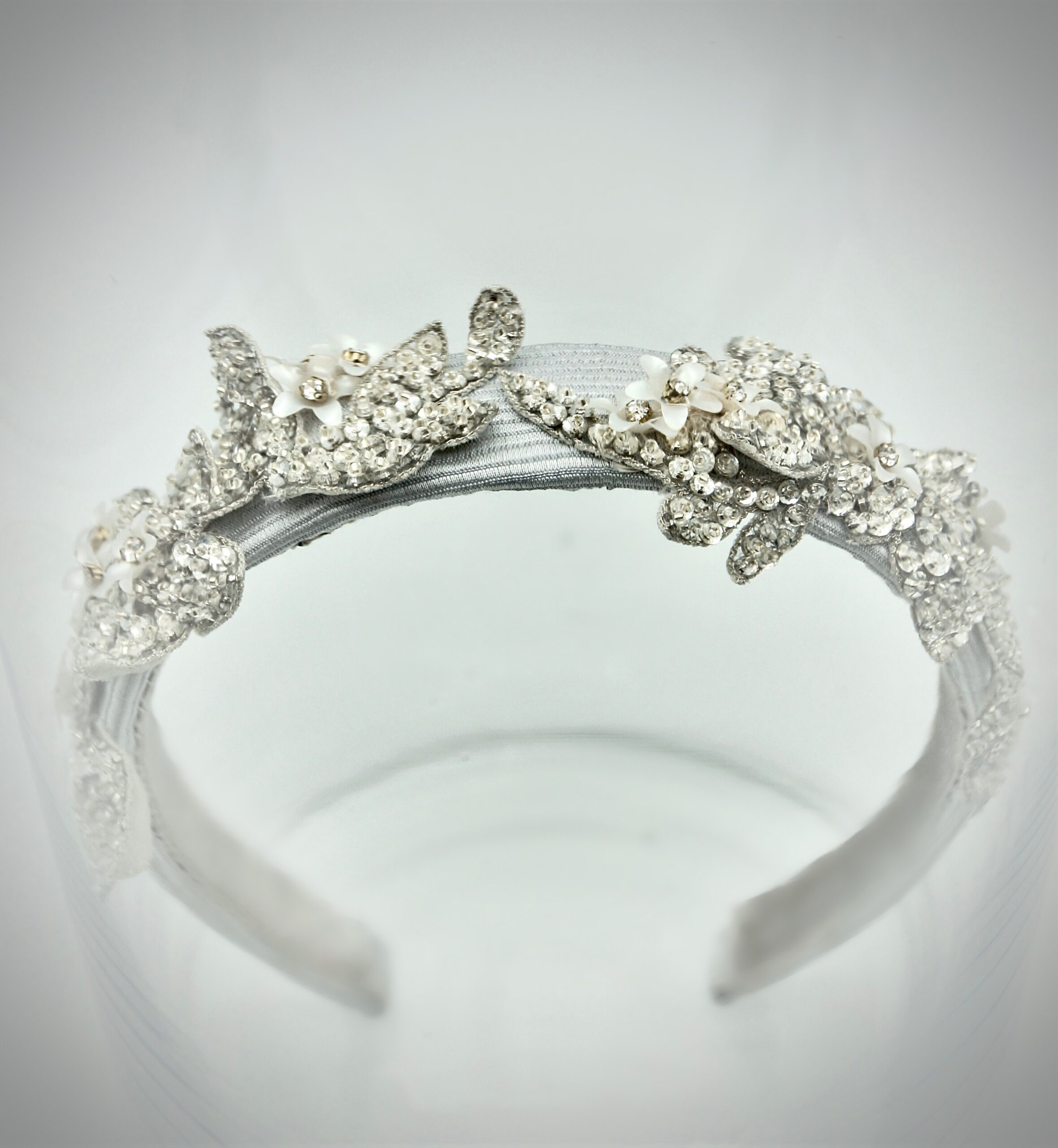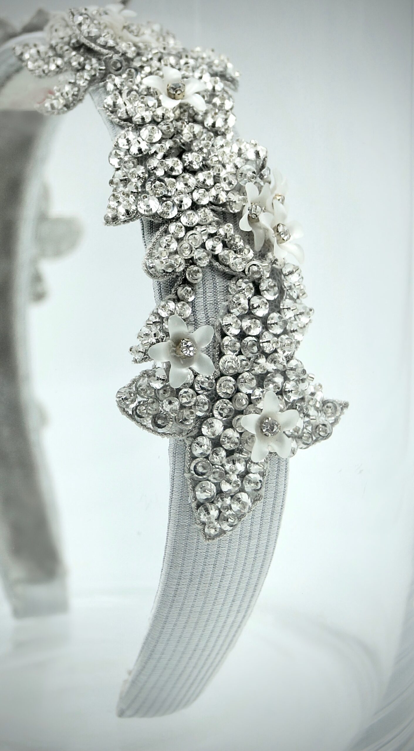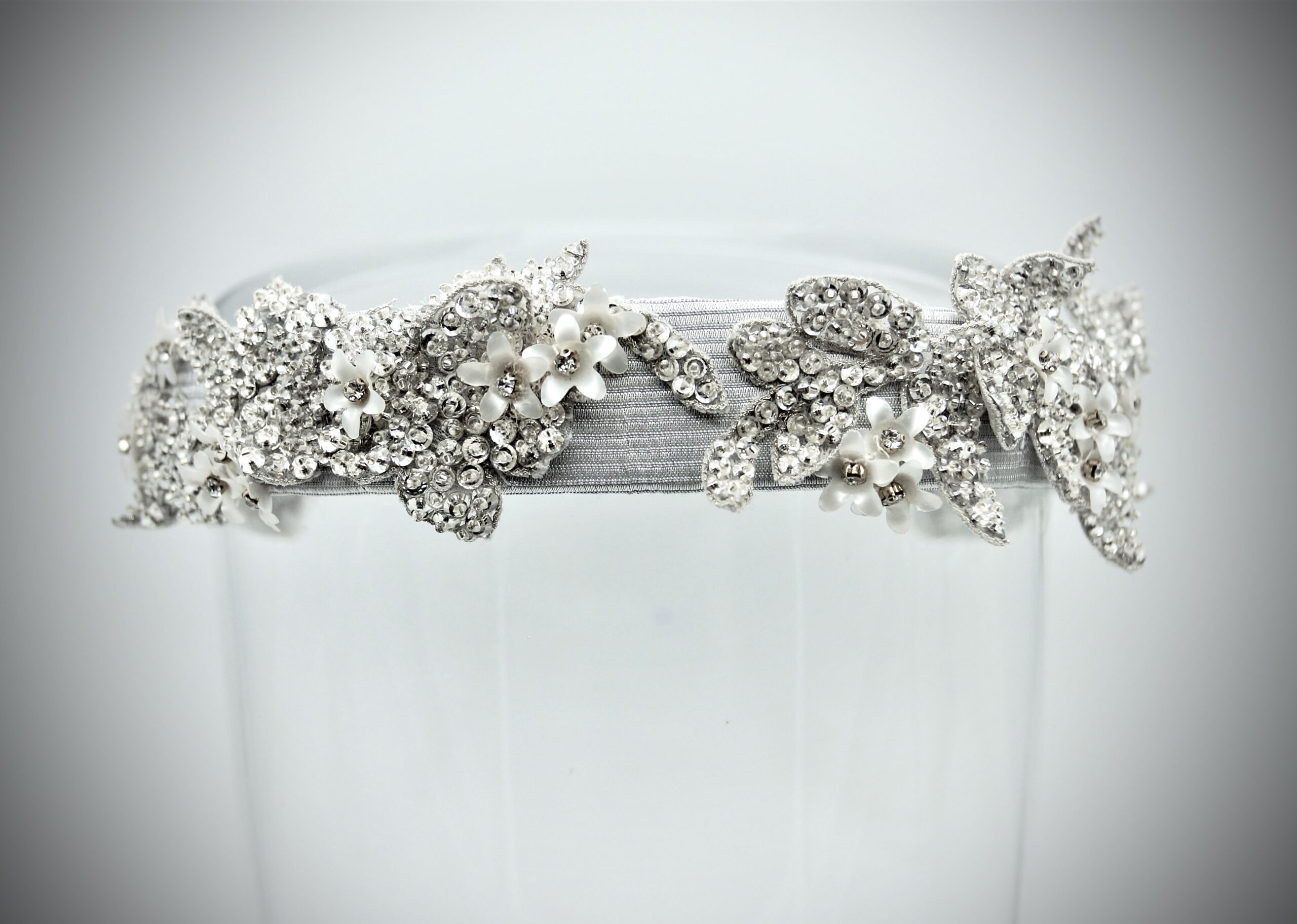 Hairband in silver grey gros cloth base embroidered with rhinestones motifs and small white 3D flowers.